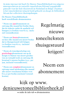 De Nieuwe Toneelbibliotheek heeft verschillende abonnementen * Neem een _JAAR_abonnement en ontvang elke maand het boekje thuis, dat de redactie onder de aandacht wil brengen (10 boekjes voor €110,- inclusief verzendkosten). * Neem een _KEUZE_abonnement en kies elke maand een nieuw boekje dat je thuisgestuurd wilt krijgen (10 boekjes voor €110,- inclusief verzendkosten). * Neem als theatergroep een _GEZELSCHAPS_abonnement om op de hoogte te blijven van nieuw geschreven en vertaald werk, steun je De Nieuwe Toneelbibliotheek, en ontvang elk kwartaal 6 nieuwe boekjes (250,- per jaar, inclusief verzendkosten).